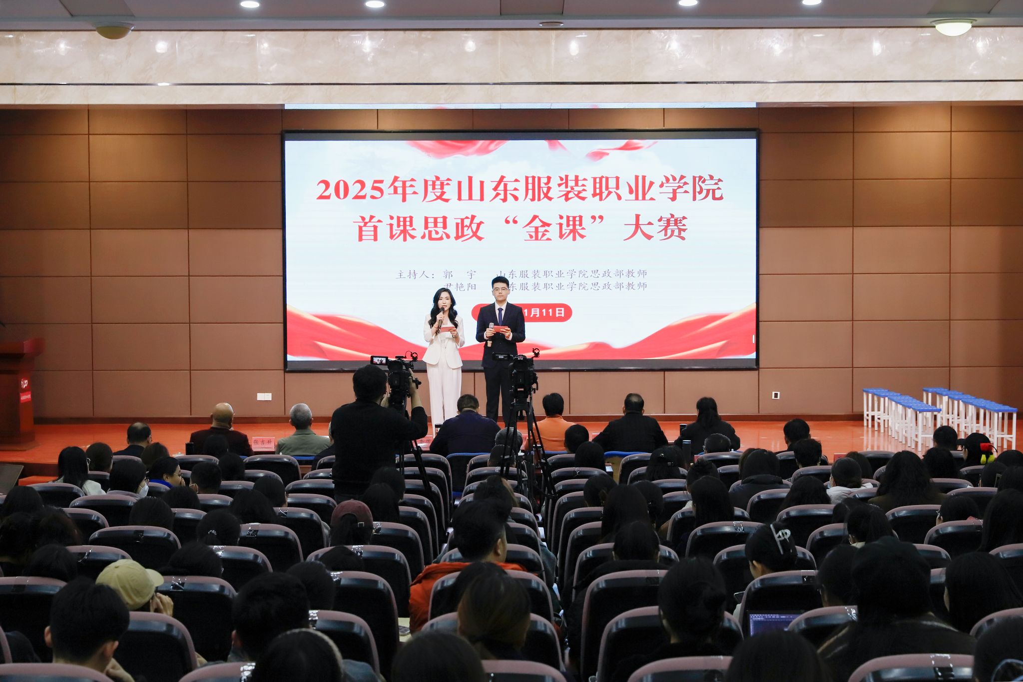 为深入贯彻落实立德树人根本任务,全面推进“首课思政负责制”工作,提升教师育人能力,11月11日,2025年度首课思政“金课”大赛在学院旅游实训中心举行。学院党委副书记、院长马培安,党委副书记韩西德,党委委员、副院长陈健,党委委员、宣传处(统战部)处长(部长)李金强,党委委员、组织人事处处长王志荣以及教务处、学工处(团委)、工会、基础部、思政部、科研处和各系负责同志出席比赛活动。各系、基础部和思政部教师代表约200人现场观摩比赛。