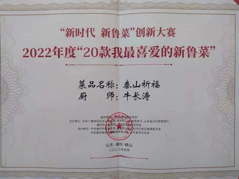 大赛以“创新鲁菜 预制未来”为主题,吸引了来自全国各省市自治区以及港澳台地区和36个国家的1000多名选手参赛。经过初赛层层筛选,174道菜品从1858道菜品中脱颖而出晋级决赛。在为期一天半的决赛角逐中,参赛选手现场制作,由40人专家评委团和众多美食达人组成评审团队,从感官创新、文化创新、功能创新等三大维度和口味口感、烹调技艺、文化内涵、绿色健康等11个下属分项对菜品进行综合评定。同时,本次决赛的烹饪现场、各组评审现场均进行直播,各场直播观看量均超百万。学院酒店管理与数字化运营专业教师和泰安琼华岛酒店技术骨干联合指导,学院学子积极备赛,现场发挥出色,2022级酒店管理与数字化运营2班张德华荣获2022年度“十大鲁菜创新菜品奖”、“20款我最喜爱的新鲁菜奖”、“100款最具价值新鲁菜奖”,2022级酒店管理与数字化运营1班牛长涛荣获2022年度“20款我最喜爱的新鲁菜奖”、“100款最具价值新鲁菜奖”。
