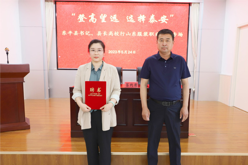 双方签订了全面战略合作协议,为“东平县引才工作站(山东服装职业学院站)”揭牌,为东平籍山东服装职业学院优秀学生代表颁发“校园引才大使”聘书,东平县重点企业向学院教师颁发“人力资源副总”聘书。