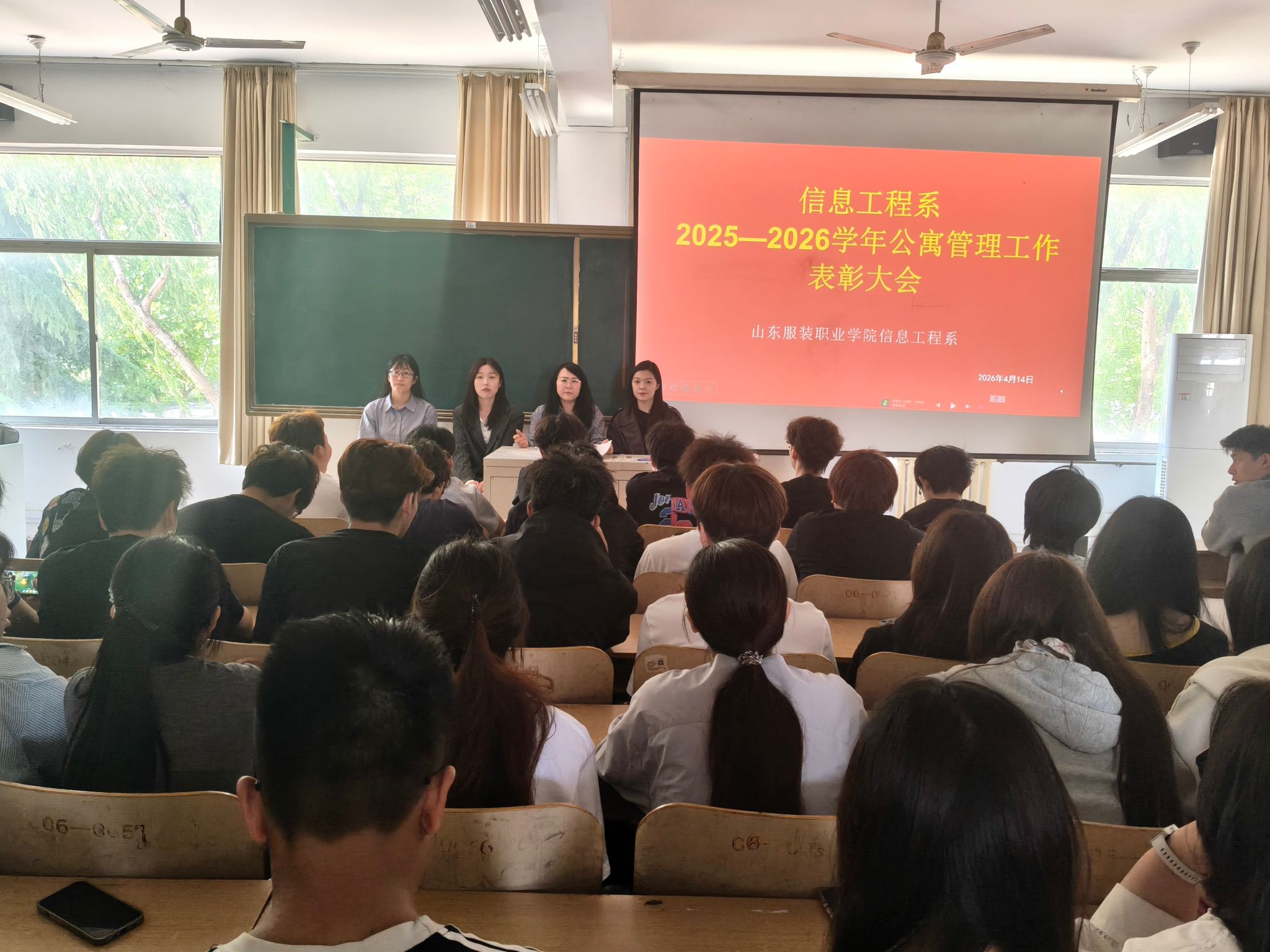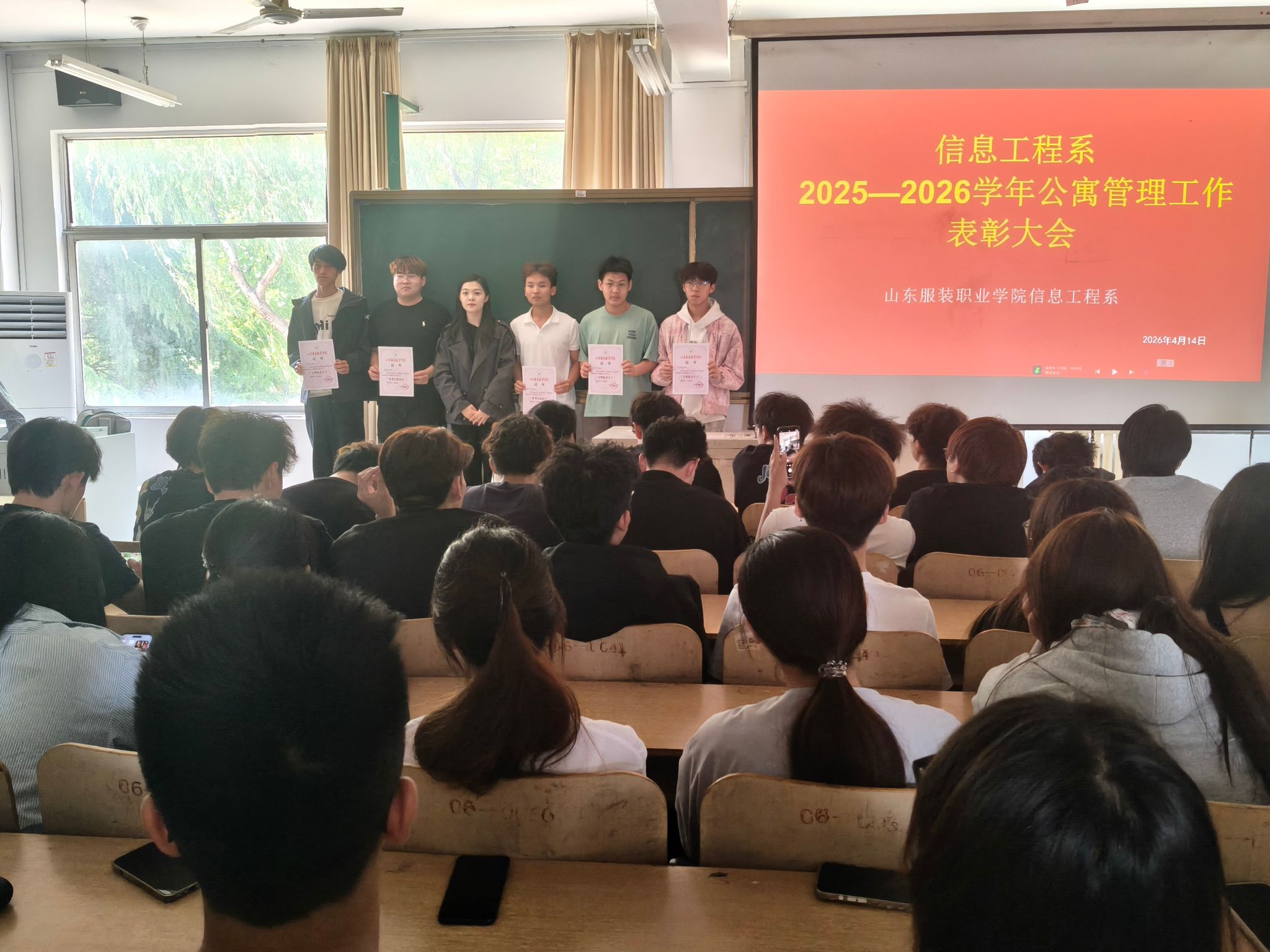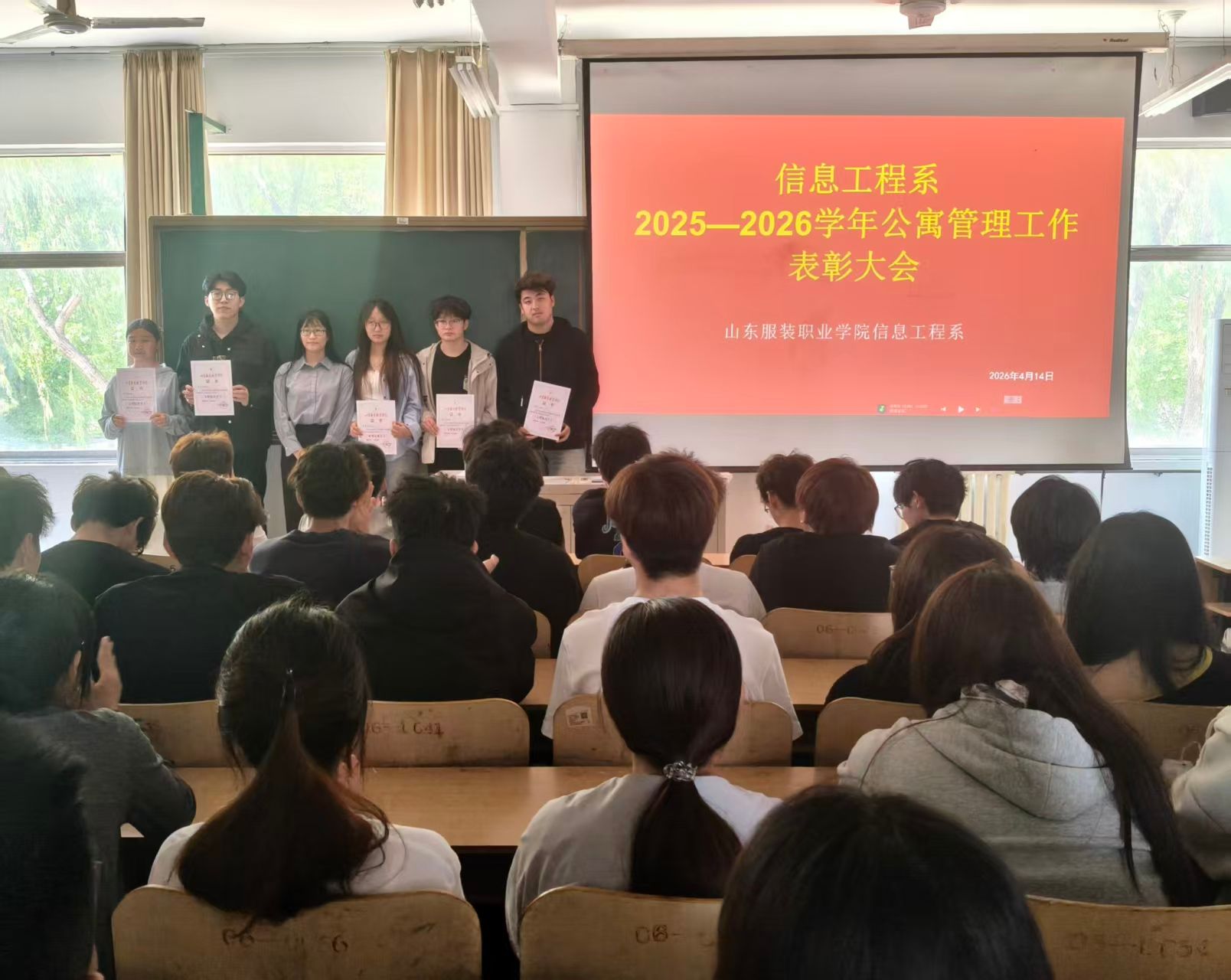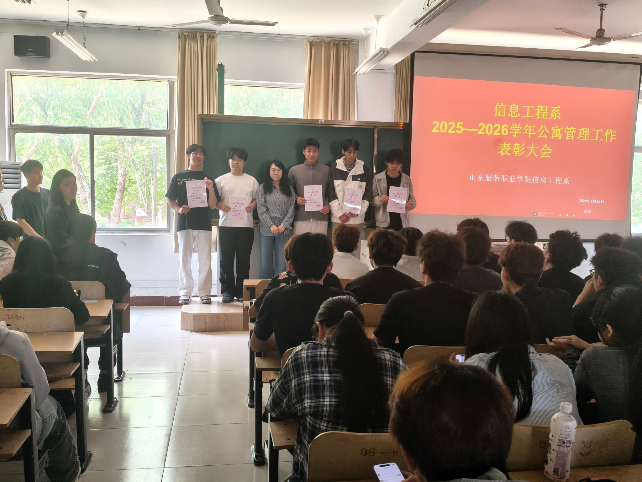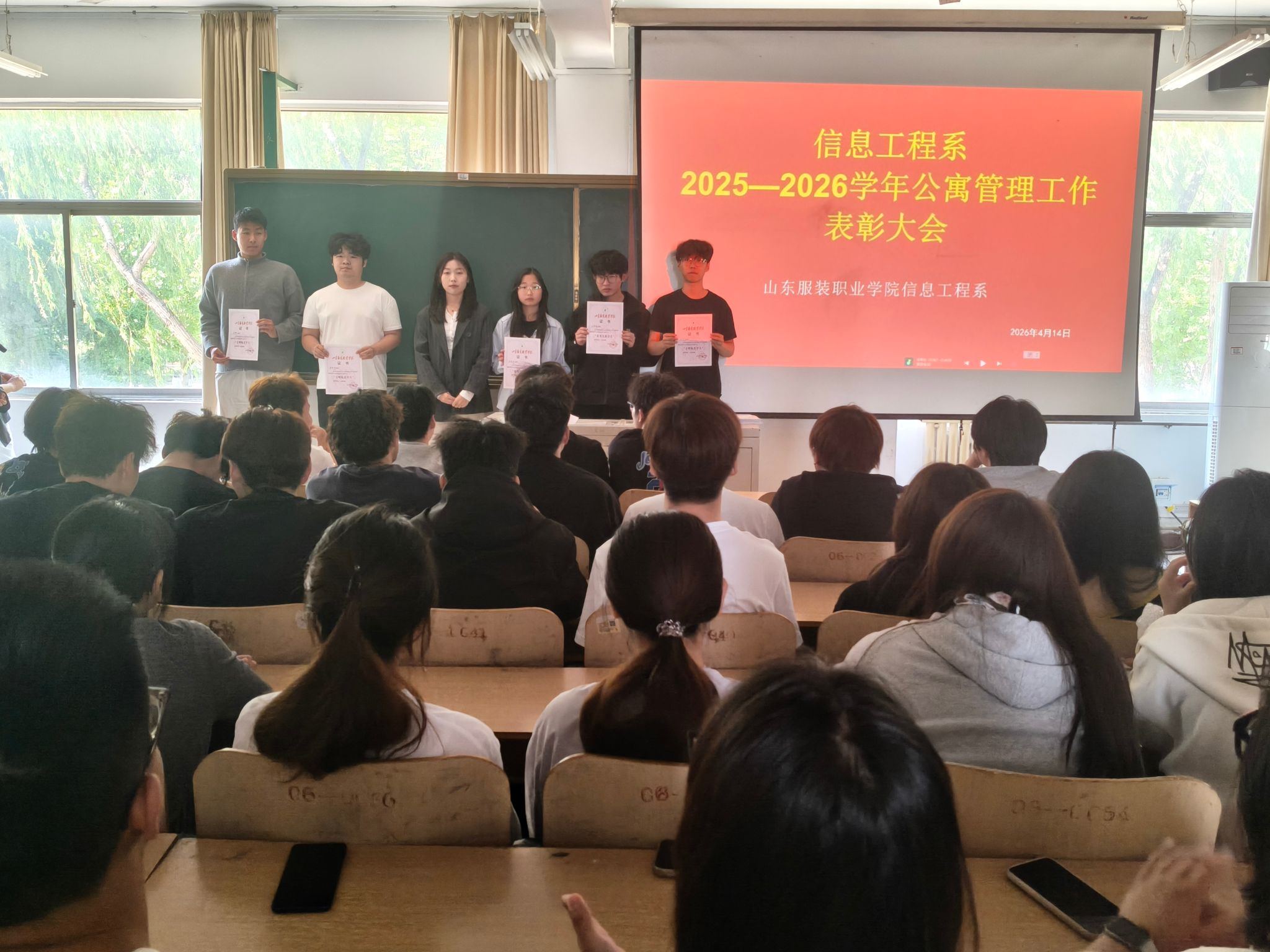为深入落实“立德树人”根本任务,充分发挥学生公寓育人阵地作用,表彰先进、树立典型,4 月 23 日下午,信息工程系组织召开2025—2026学年公寓管理工作表彰大会。为在公寓管理服务工作中表现突出的先进个人颁奖,以榜样力量引领文明公寓建设新风尚。