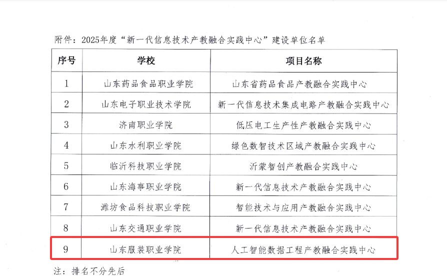 近日,山东省职业教育和产业人才研究院正式发布《关于公布2025年度“新一代信息技术产教融合实践中心”建设单位名单的通知》(省职研函〔2025〕20号)。经过学校自主申报、专家组集中评审与现场考察等环节,我院信息工程系申报的“人工智能数据工程产教融合实践中心”成功入选,被确定为2025年度“新一代信息技术产教融合实践中心”建设单位。