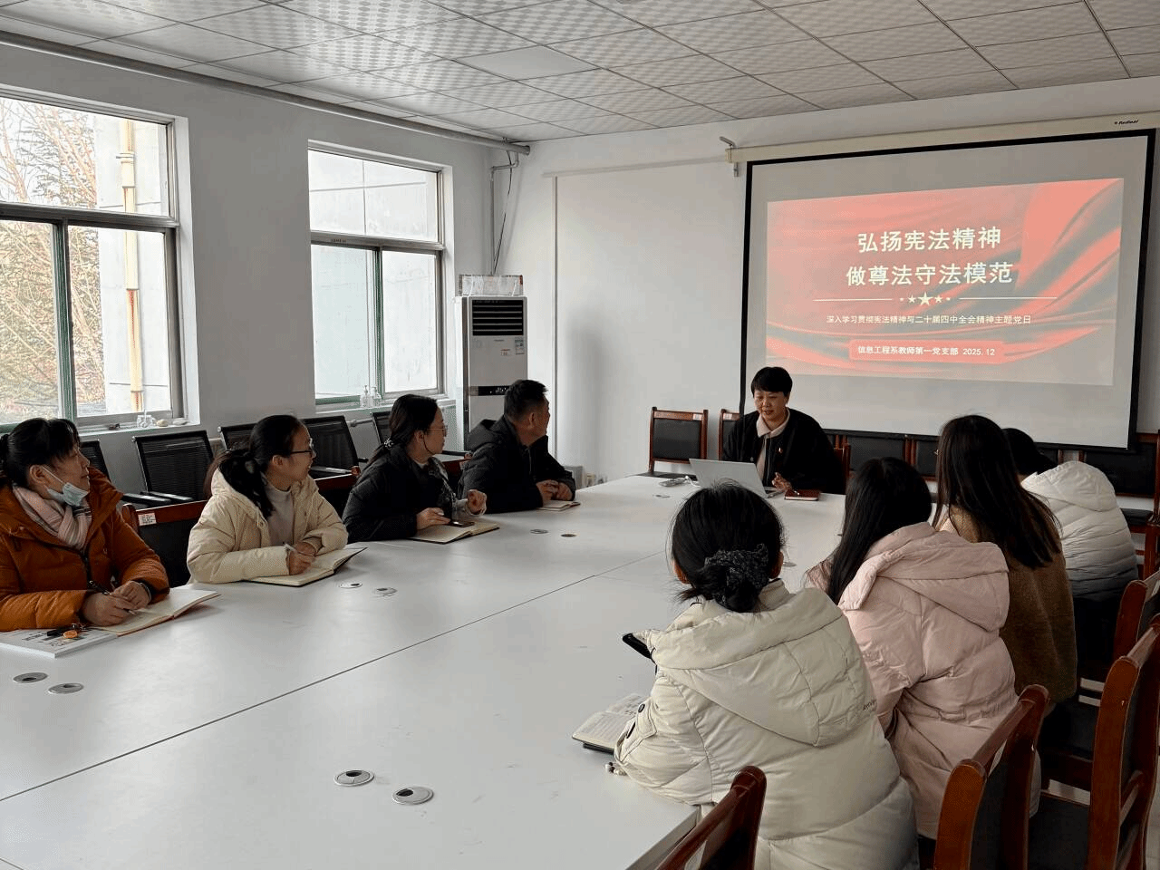 为深入贯彻落实党的二十届四中全会精神及习近平法治思想,强化教师党员的宪法意识与法治观念,2025年12月19日下午,信息工程系教师第一党支部在系会议室开展“弘扬宪法精神 做尊法守法模范”主题党日活动。