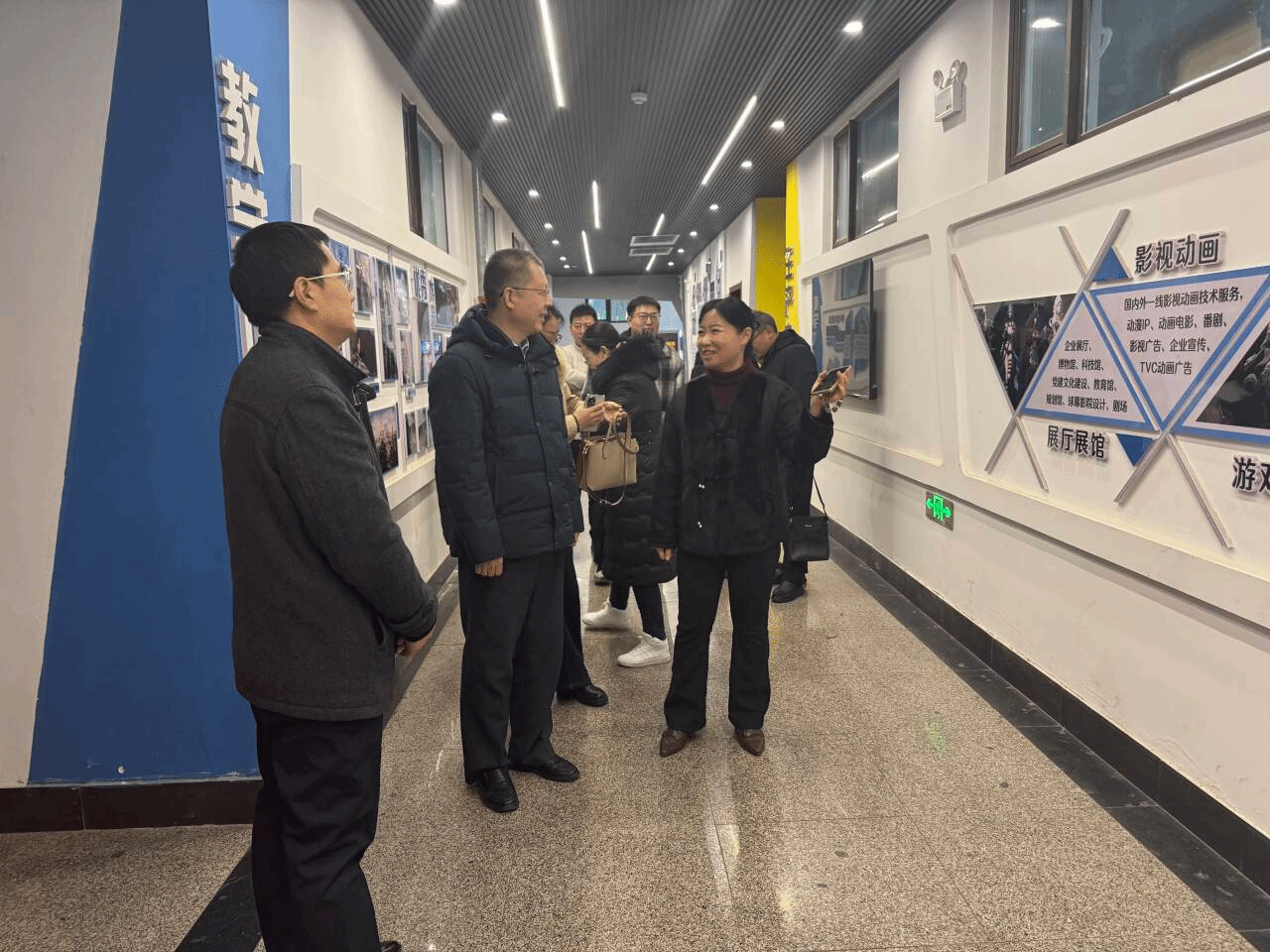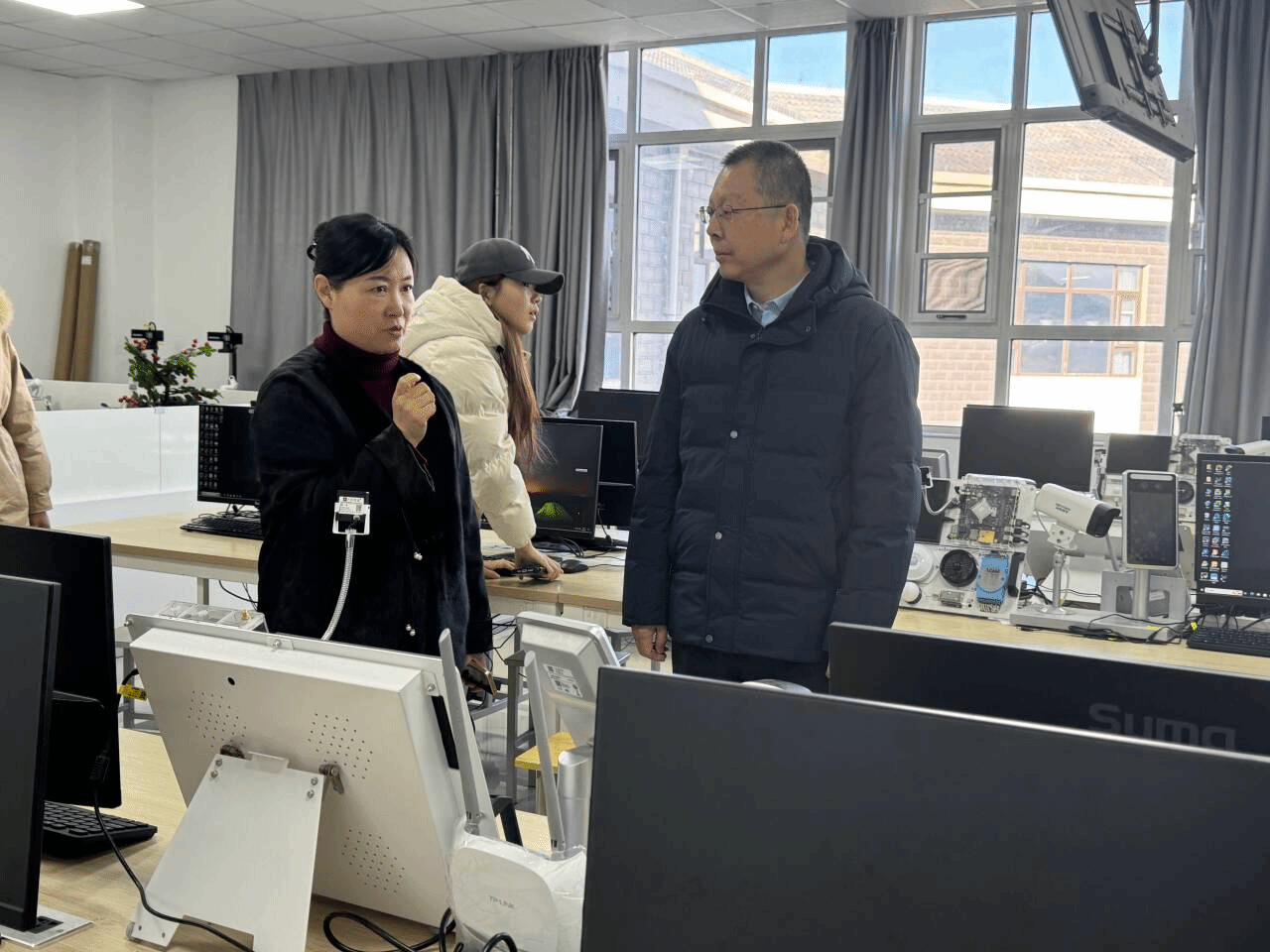 杨继鹏一行首先走访潍坊工程职业学院虚拟现实产业学院,实地察看虚拟现实技术应用等多个专业实训室。考察过程中,李琴院长详细介绍了虚拟现实产业学院的建设背景、办学特色、校企合作成效及实训室功能定位、设备配置、教学运行机制等情况。随后,考察团还先后参观了计算机应用技术、大数据技术等其他专业实训场地,深入了解各专业实训体系的构建与运行情况。