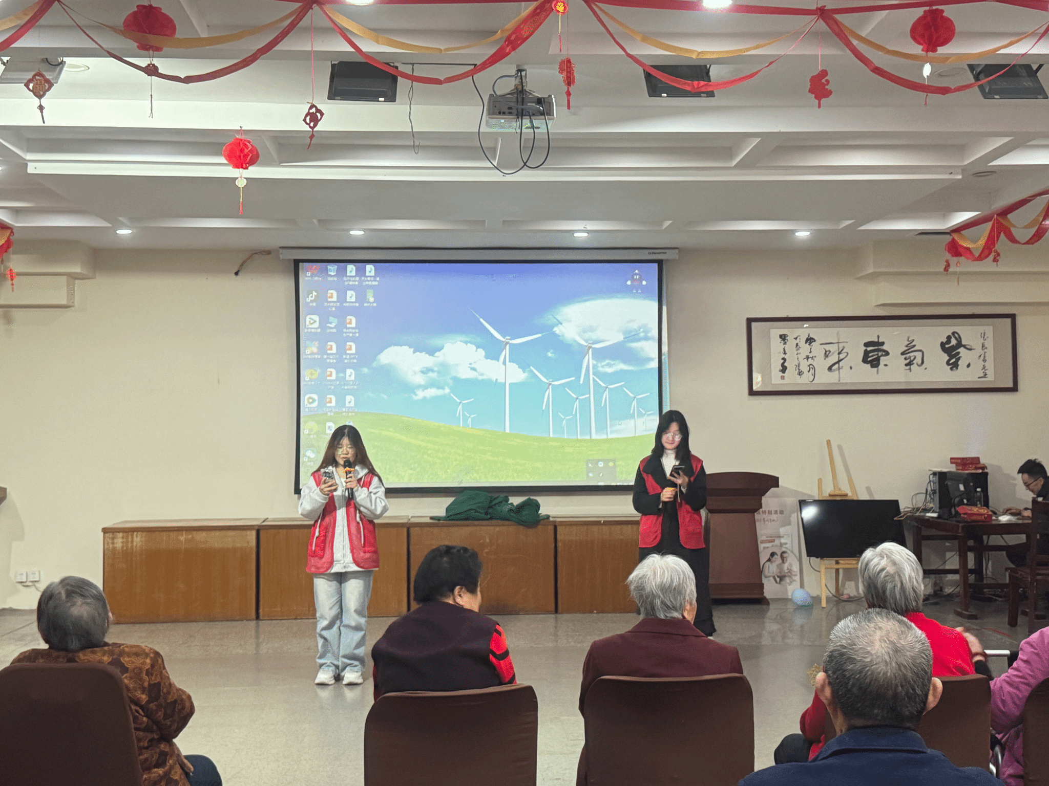 表演结束后,同学们围坐在老人身旁,耐心倾听、贴心陪伴。大家与老人们促膝长谈,详细询问他们的身体状况与日常生活,认真聆听他们讲述过往经历。一句句问候、一声声祝福,拉近了彼此的距离,让养老中心洋溢着温情与欢笑。