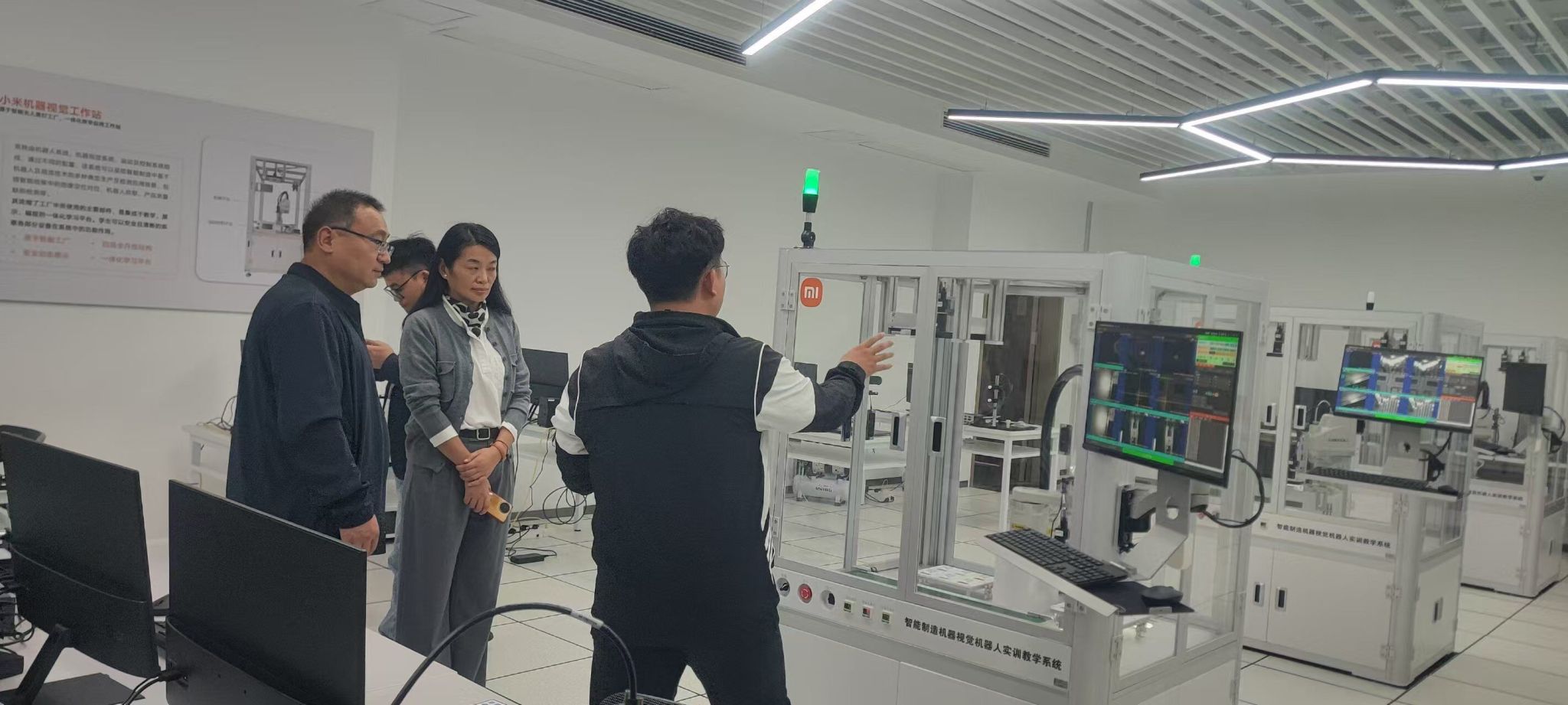 在雍德钰、徐晶的陪同下,刘凌一行首先参观了基地人工智能实训室、机器视觉实验室、AIOT实训室,详细了解各实训区的产业级设备配置、项目化教学模式,以及与企业实际生产场景的衔接情况。