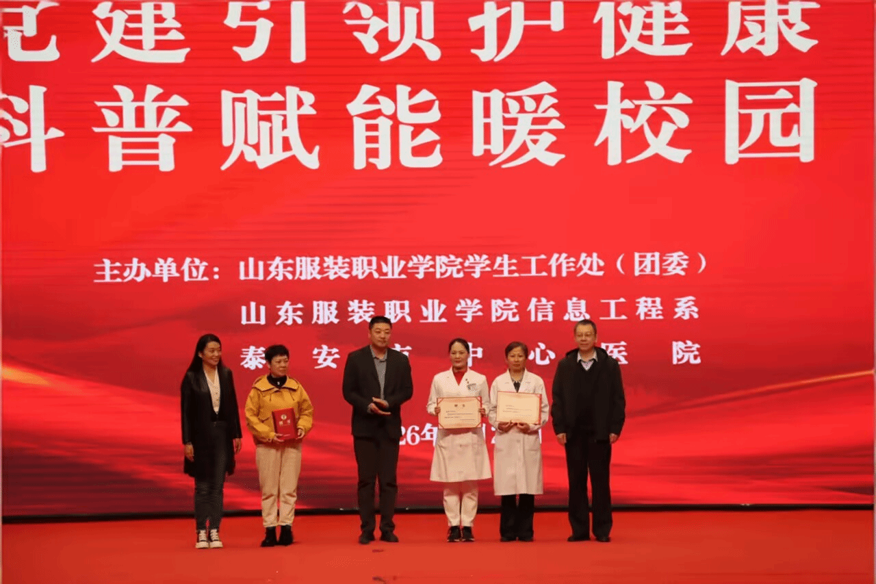 为深入贯彻党的二十大和二十届历次全会精神,落实“健康中国”战略部署,以高质量党建引领校园健康服务,切实提升师生健康素养,3月26日,山东服装职业学院学生工作处(团委)、信息工程系联合泰安市中心医院,举办“党建引领护健康 科普赋能暖校园”健康公益活动。学院党委委员、副院长刘家贵,学生工作处处长张林,信息工程系党总支书记刘凌、系主任杨继鹏,泰安市中心医院健康管理部社区医疗中心社区医疗办主任甄力、院办主任王晓菲,泰安市红十字会办公室主任张玲等出席活动。信息工程系全体师生及各系师生代表共同参与。