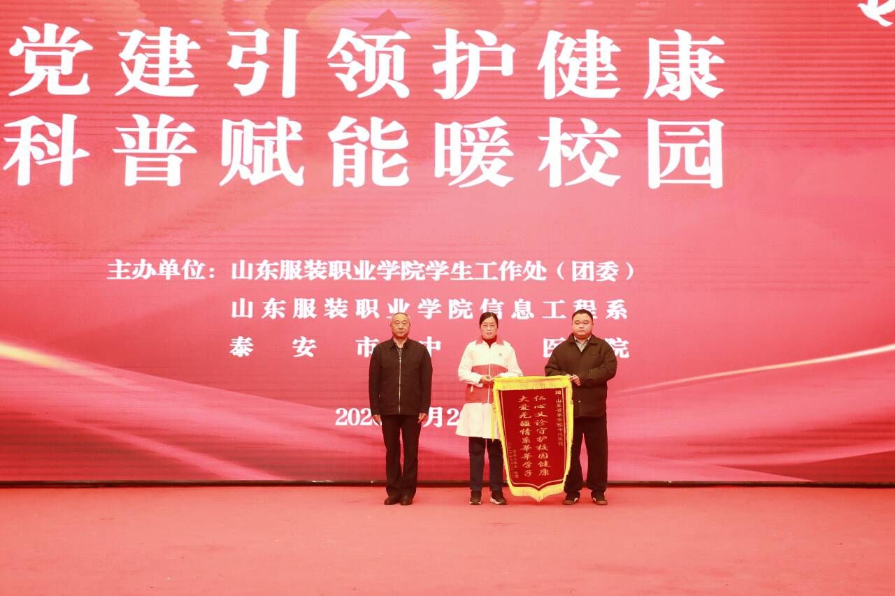 活动开始前,张林、刘凌、杨继鹏为泰安市中心医院杨翠平、刘晓琰、王兆丽三位专家颁发了“健康科普讲师”聘书,旨在搭建长期校园健康科普平台。随后,学院党委委员、副院长刘家贵代表学院向泰安市中心医院赠送锦旗,对医院长期以来给予学校健康事业的大力支持表示诚挚感谢。