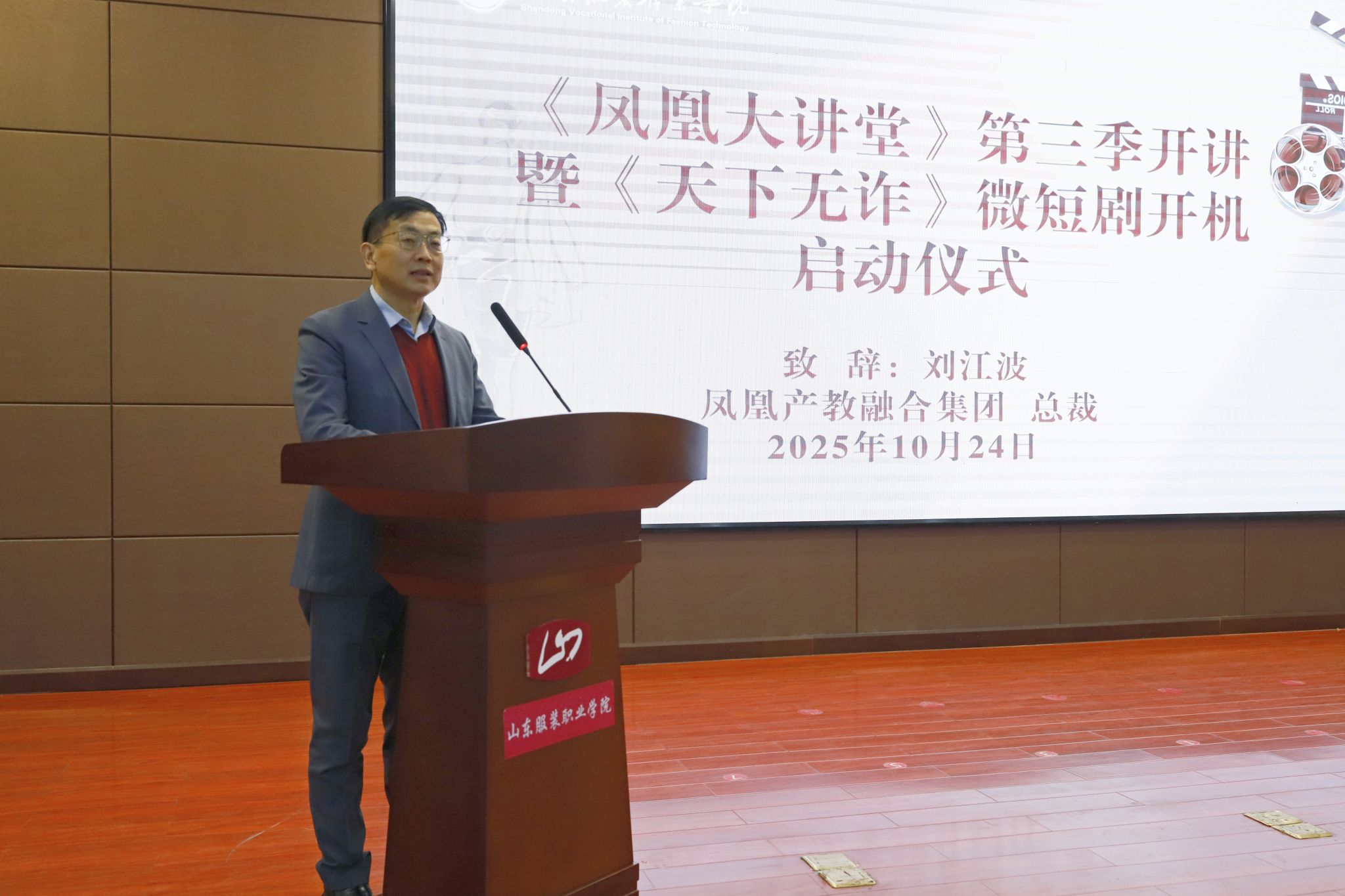 刘江波在致辞中表示,山东服装职业学院凤凰传媒学院成立以来,在双方的共同努力下,各项工作稳步推进、成果初显。其中,“凤凰大讲堂”作为学院重点打造的特色项目,已成为拓展学生视野的重要平台。校园防诈题材微短剧《天下无诈》则是深化产教融合、赋能高水平专业群建设的创新实践。