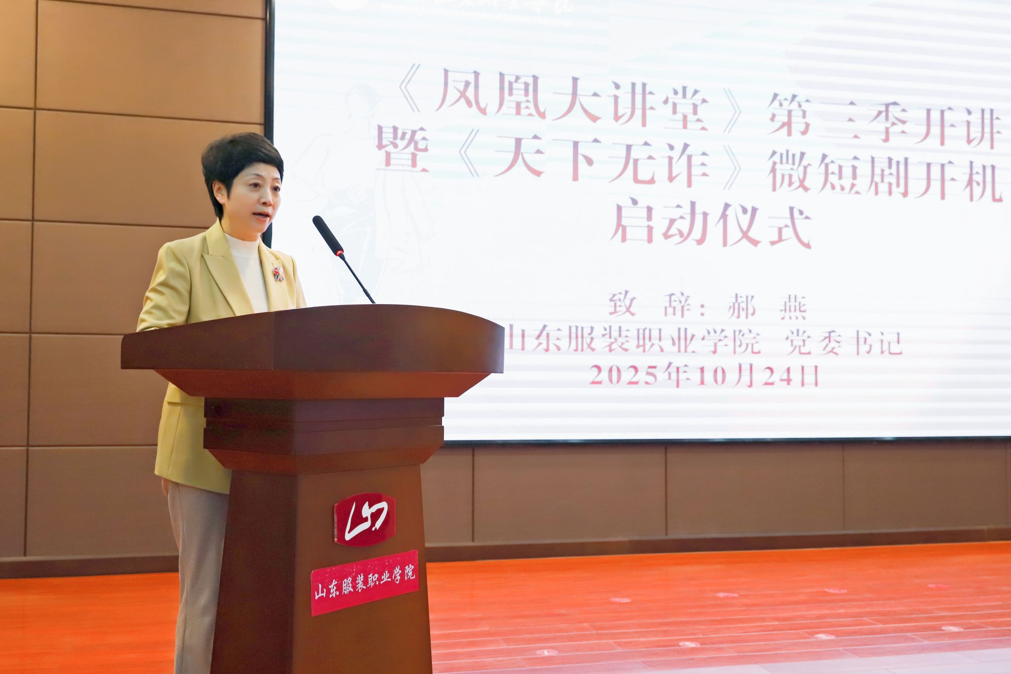 郝燕在致辞中表示,自去年5月凤凰产业学院成立以来,学院与凤凰产教融合集团持续深化务实合作,坚守“对接产业前沿、培育技术人才”初心,以“凤凰大讲堂”等平台为重要载体,通过行业大师授课、实战经验分享、企业观摩实践,让学子近距离触摸产业脉搏。今天大讲堂正式开启第三季,我们与肖东坡老师和张歌东教授达成亲密合作,共建“东坡工作室”,聘请张歌东教授为客座教授。《天下无诈》微短剧的开机,标志着学院与凤凰产教融合集团的合作从“知识传递”升级为“成果共创”。山东服装职业学院愿以更开放的姿态、更长远的视野,深化与凤凰产教融合集团的战略合作,以凤凰产业学院、“凤凰大讲堂”等载体为纽带,搭建共享、共育的双向通道,探索更多可复制、可推广的产教融合经验,为行业发展注入新活力,为学生成长搭建新平台,培养更多德技并修的“金凤凰”。