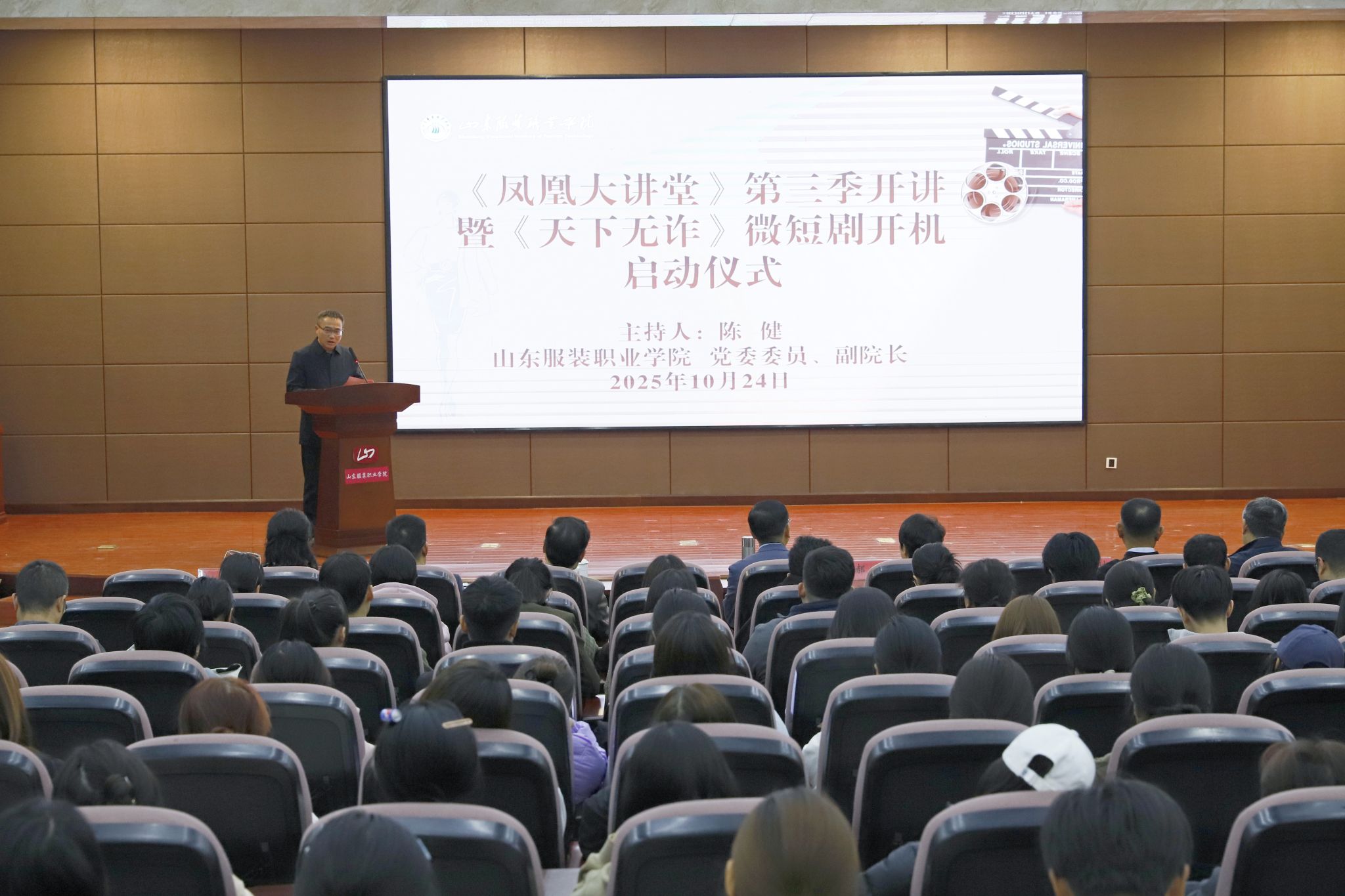 10月24日,“凤凰大讲堂”第三季暨《天下无诈》微短剧启动仪式在山东服装职业学院旅游实训中心举行。山东服装职业学院党委书记郝燕,凤凰产教融合集团总裁刘江波,著名电视节目主持人肖东坡,中国传媒大学动画与数字艺术学院教授张歌东,山东服装职业学院党委副书记韩西德出席启动仪式。启动仪式由学院党委委员、副院长陈健主持。