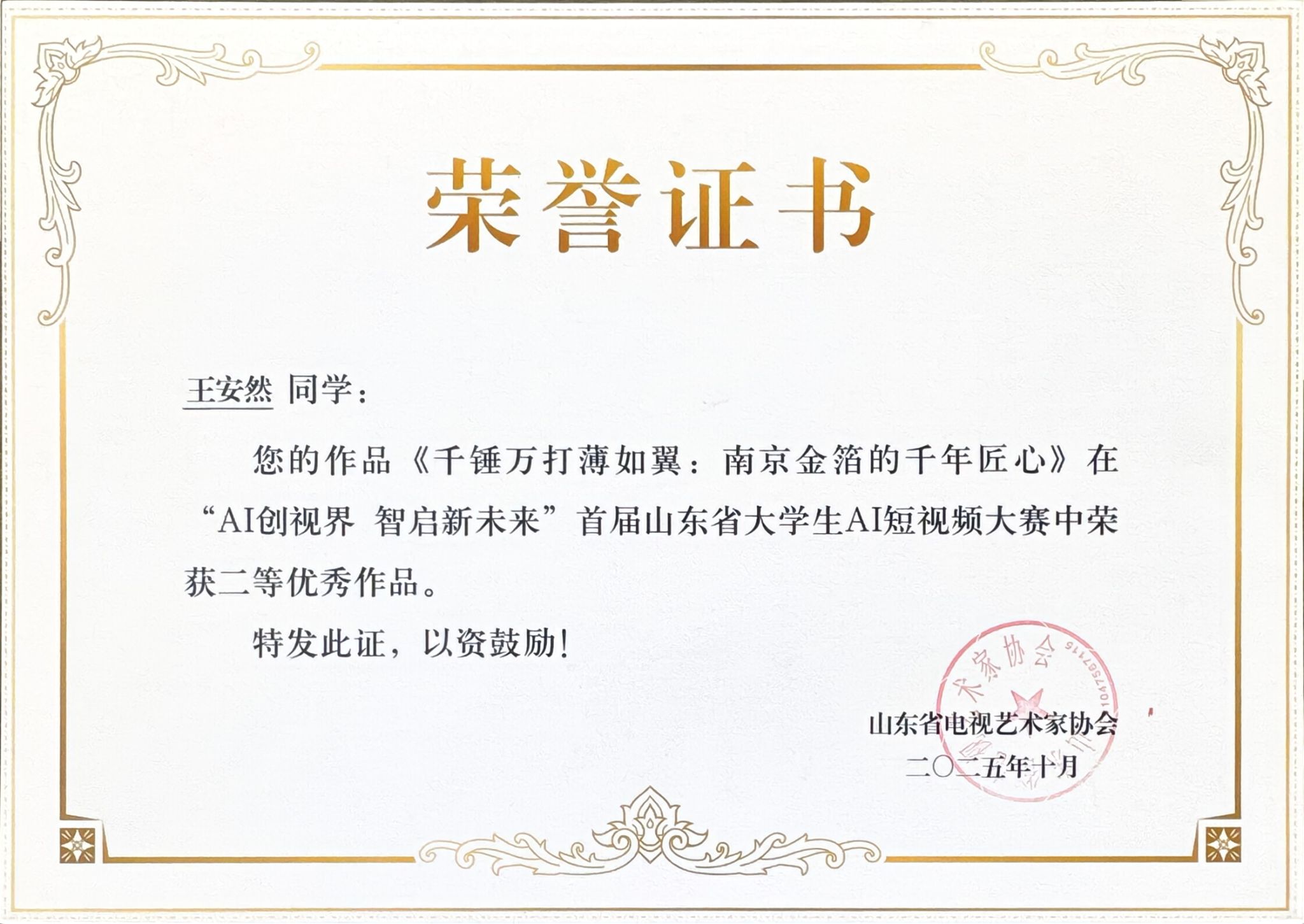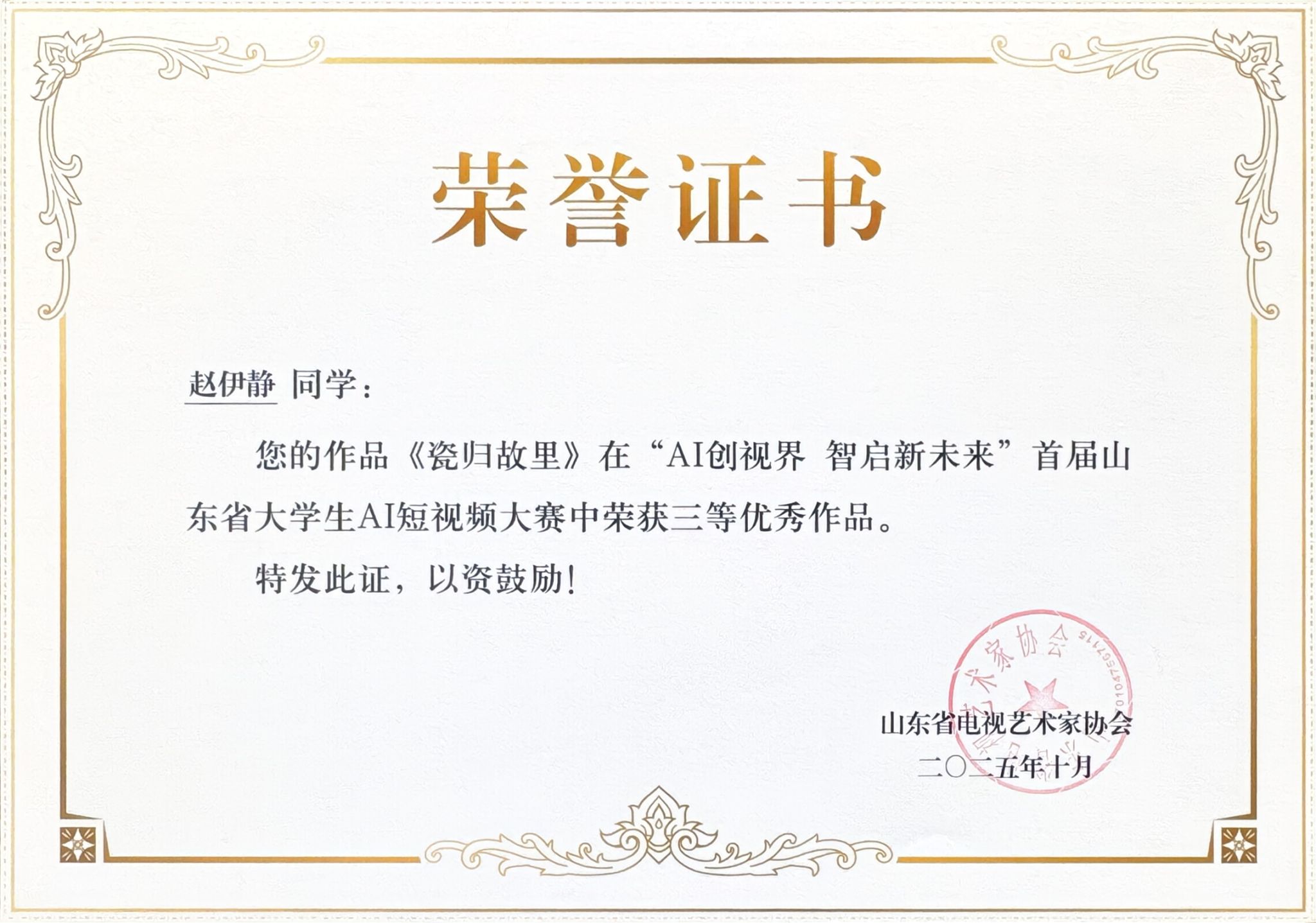 近日,“AI创视界 智启新未来”首届山东省大学生AI短视频大赛传来喜讯!凤凰传媒学院王安然、李雨晴、赵伊静三位学子,依托学院紧密对接产业需求的教学体系,凭借在真实产业项目实践中锤炼出的AI创意作品脱颖而出,分别斩获两项二等奖、一项三等奖,充分展现了学院以产业为导向、以实践为驱动的教学改革成果。
