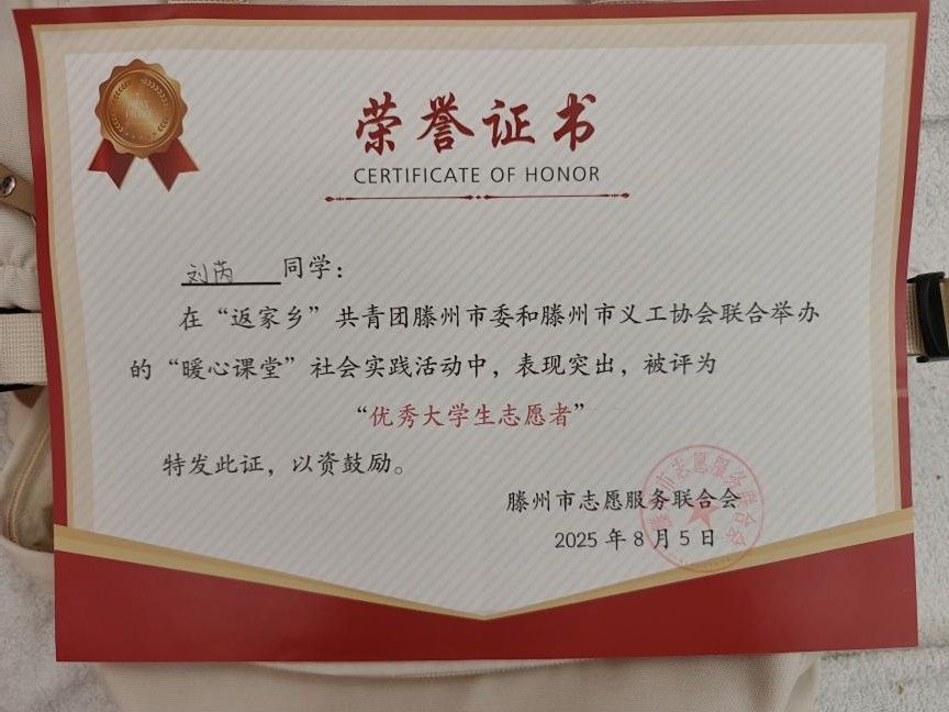 网络新闻与传播专业的刘芮同学,主动参与共青团滕州市委与滕州市义工协会联合举办的“暖心课堂”志愿服务项目。在“暖心课堂”中,她充分发挥专业特长,为当地留守儿童开展知识科普、兴趣辅导等课程,用耐心与爱心陪伴孩子们度过充实假期。凭借在服务过程中的突出表现、认真负责的态度及受到服务对象与组织方的高度认可,刘芮同学被授予“优秀大学生志愿者”荣誉称号,成为暑期社会实践中的优秀典范。