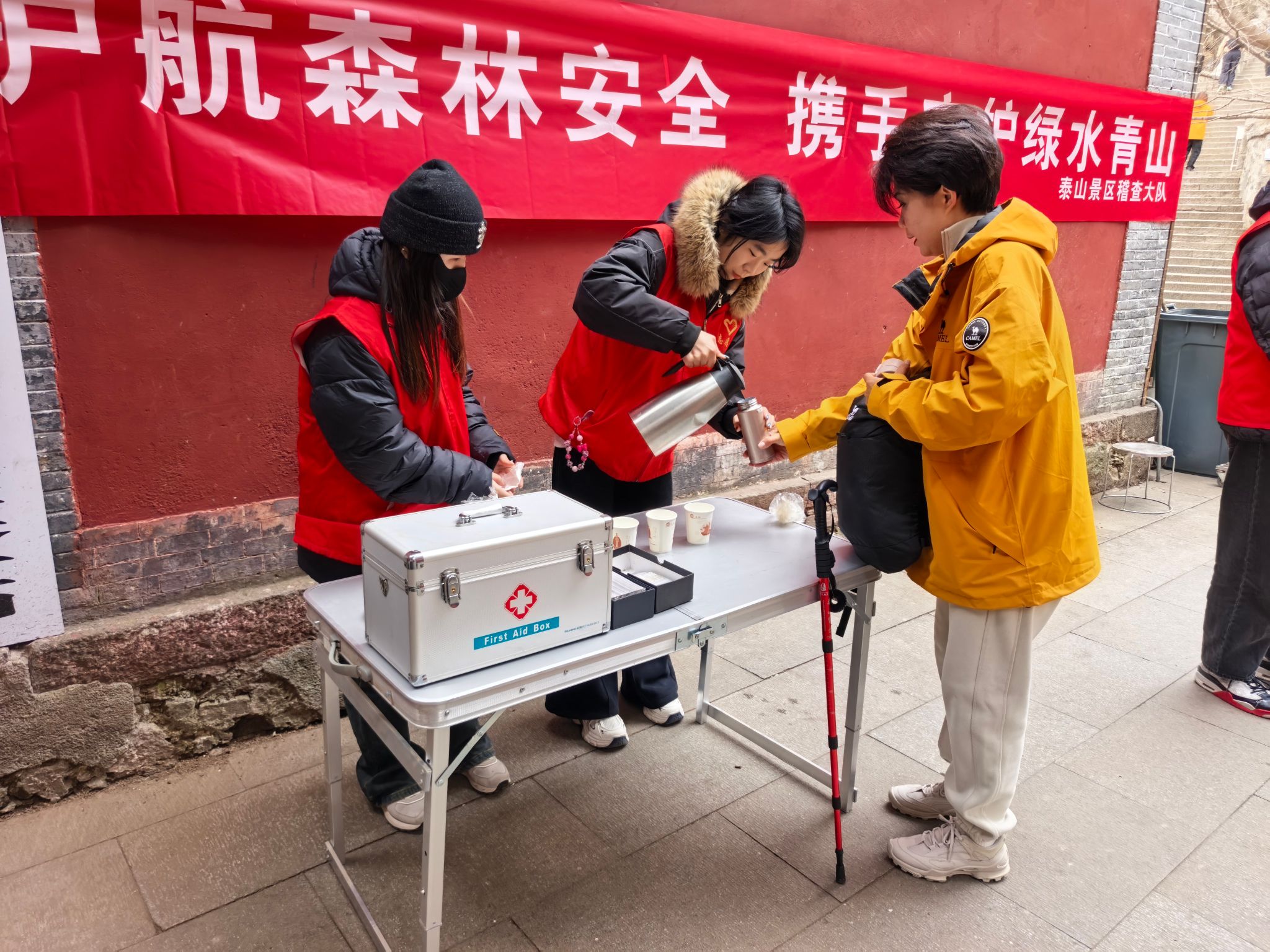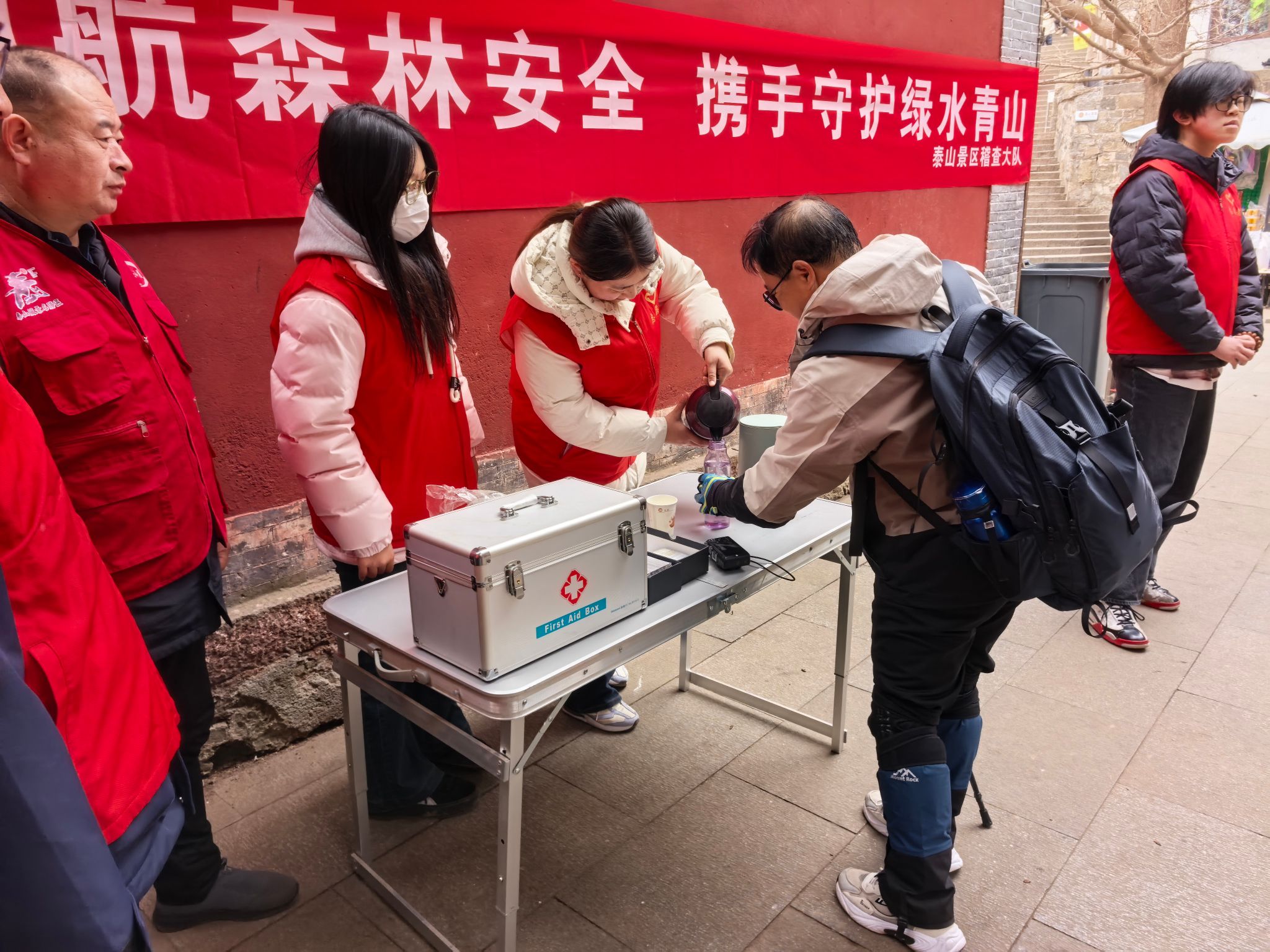 活动当日,志愿者们在工作人员的引领下来到检查站,迅速投入服务岗位。他们为往来游客提供热水、路线指引与应急帮助,为冬日的登山路途增添阵阵暖意;同时积极配合稽查大队开展安全巡查,协助查验火源、发放冬季防火提示卡,凝聚起“人人防火、共护青山”的共识。