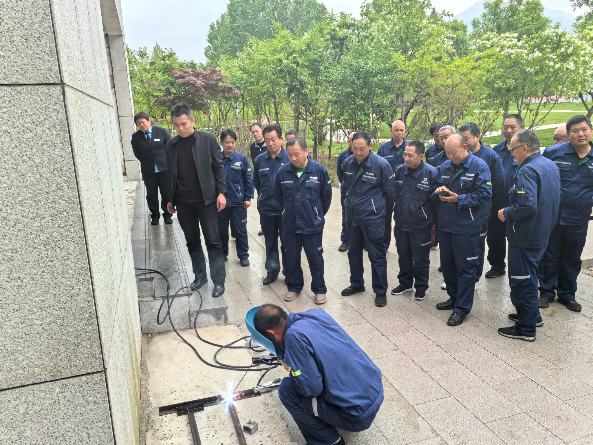理论培训结束后,参训人员前往户外实训场地开展焊接实操演练。维修骨干现场进行焊接作业演示,从设备检查、前期准备到规范操作、成品检验,严格按照标准流程开展作业;总务处及保丽金康集团的现场指导人员,针对操作细节、安全防护等方面进行实时点评与示范讲解,帮助参训人员快速掌握实操要点,提升规范操作能力。参训人员全程观摩学习、交流经验,在实践中深化了对标准化维修流程的理解。